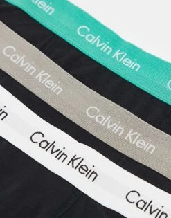 Calvin Klein Cotton Stretch Trunks 3 Pack In Black With White/mint/beige Waistband For Men