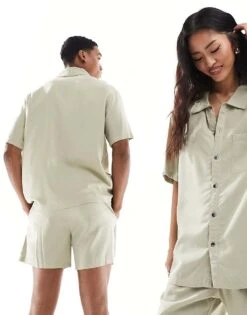Calvin Klein Woven Sleep Shirt And Short Set In Beige Grey For Unisex